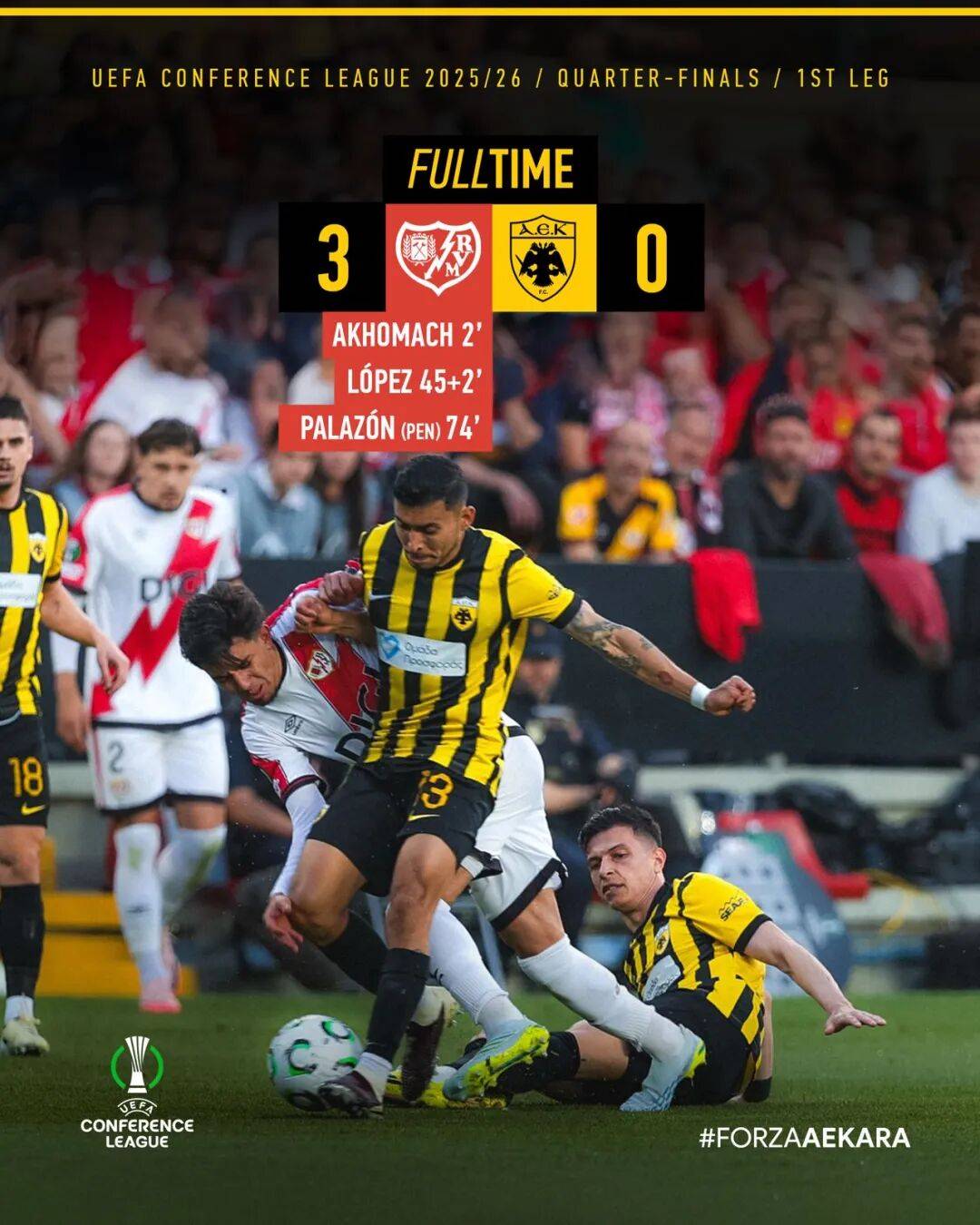 雅典AEK在上周的交锋中客场0-3惨败,这几乎葬送了他们晋级的希望。雅典AEK开场两分钟就被巴列卡诺的闪电战打了个措手不及,随后雅典AEK再丢一球但攻方球员干扰门将被判无效。雅典AEK也有机会,但瓦尔加的射门被巴列卡诺门将巴塔利亚扑在门柱上。上半场伤停补时雅典AEK再丢一球,下半场雅典AEK球员禁区内手球,巴列卡诺趁机打入第三球。雅典AEK输球后主教练尼科利奇表示场地湿滑造成球员多次滑倒,直指巴列卡诺的盘外招有失公平。雅典AEK曾在1976/1977赛季的欧洲联盟杯客场0-3输给女王公园巡游者,回到主场回敬对手一个3-0,最终点球大战晋级四强,可惜半决赛输给了尤文图斯,那也是他们唯一一次闯入欧战四强。