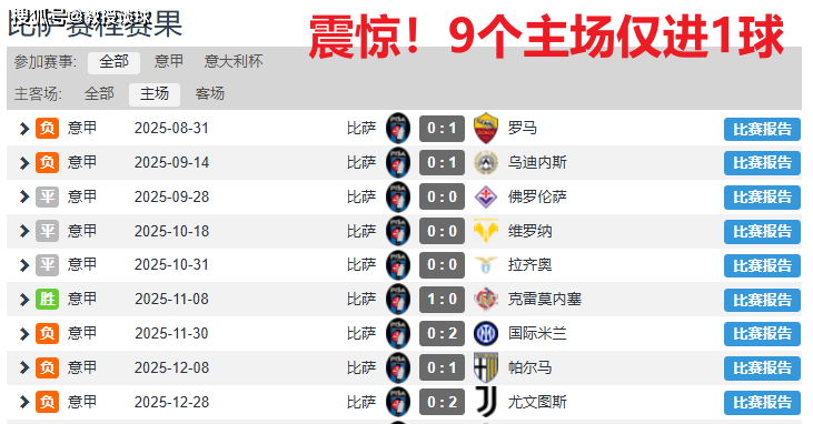 主场本应是球队的避风港,是拿分的温床,但在比萨脚下,这片草皮仿佛变成了沼泽。每当比赛开始,随着时间一分一秒流逝,如果迟迟无法破门,看台上的叹息声就会变成压在球员心头的大山。